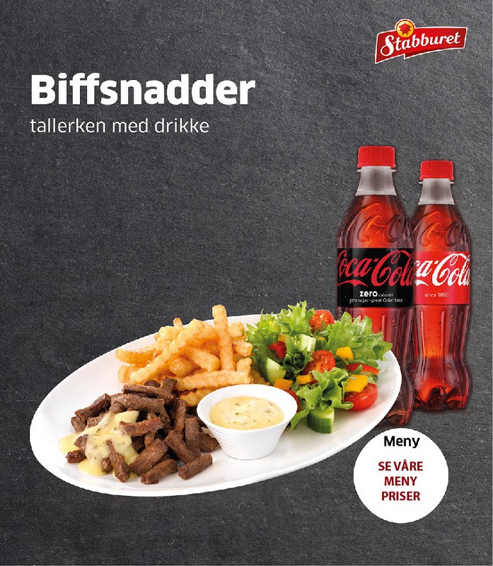 Med pommes frites og drikke.